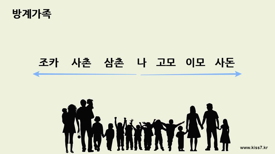 또한 할아버지와 결혼한 어머니도 가족인 것처럼, 딸과 결혼한 사위, 아들과 결혼한 며느리도 다 직계가족으로 본다고 생각하면 됩니다. 그러나 방계는 그 외의 모든 관계를 말하므로, 형제자매 관계, 사촌 관계 등이 다 여기에 해당됩니다.