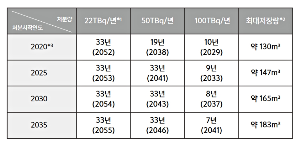 소위원회가 보고서에 명시한 것처럼 2020년에 방류를 시작하는 것은 아니지만 이를 참고치로 제시했다는 것이 주목할 부분이다. 위 표의 핵심은 2035년부터 연간 최대 22TBq를 방류하면 완료 시점이 2055년이라는 것이다. 반면, 2020년부터 동일하게 최대 22TBq를 방출하는 경우에는 2052년에 완료된다. 다시 말해, 2035년까지 15년간 방출을 보류하면 방류 완료까지 21년이 걸린다. 반면 2020년에 결정하면 방류작업이 33년 걸린다.