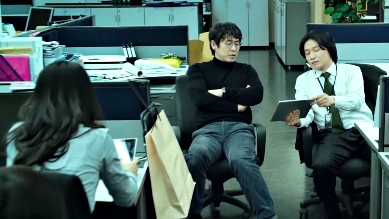 한편 감시자를 쫓아가던 윤주는 황 반장(설경구)에게 추궁받습니다. 사실 그녀는 신입 감시 업무 테스트를 받고 있었던 것입니다. 그녀는 황 반장을 따라 이 실장(진경)과 팀원들에게 인사하러 갑니다. 여기에서 황 반장은 장난으로 그녀에게 "꽃돼지"라는 코드네임(요원명)을 지어주었습니다.