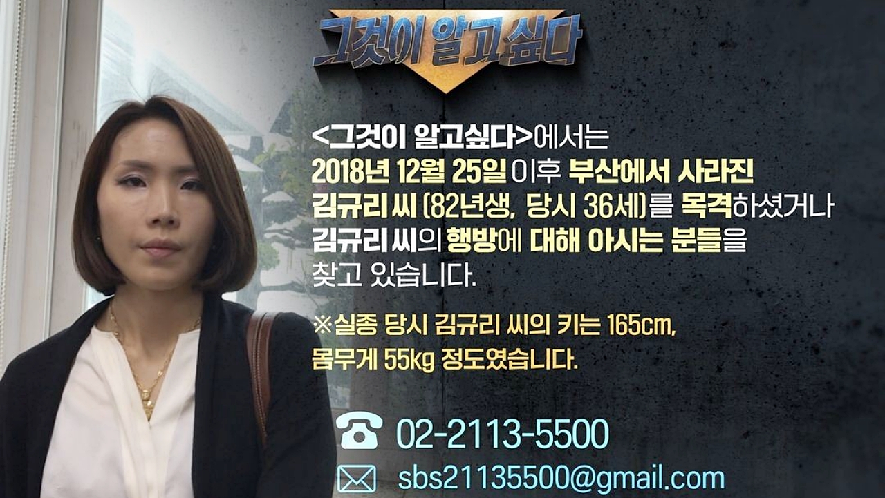 부산에서 실종된 "김규리 실종 사건"을 취재하던 제작진은 이에 김규리의 얼굴 사진도 올리며 공개 제보 요청을 하고 있는 상태입니다. 1982년생으로 키 165cm에 몸무게 55kg의 약간 마른 체형이라는데, 본 적이 있다면 02-2113-5500나 sbs21135500@gmail.com로 연락을 바라고 있습니다.