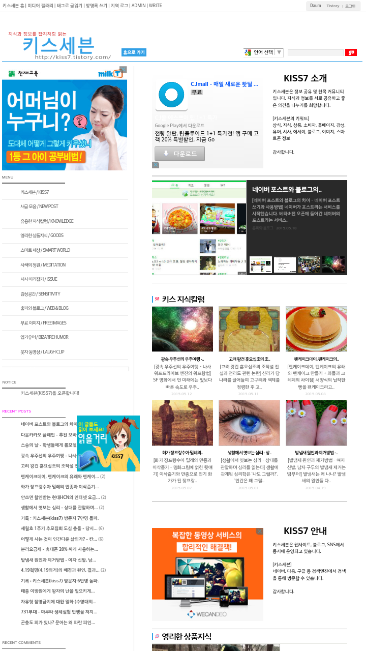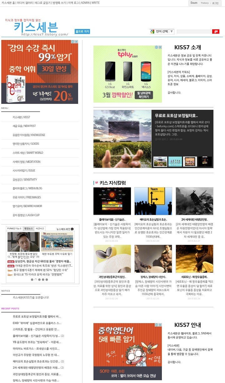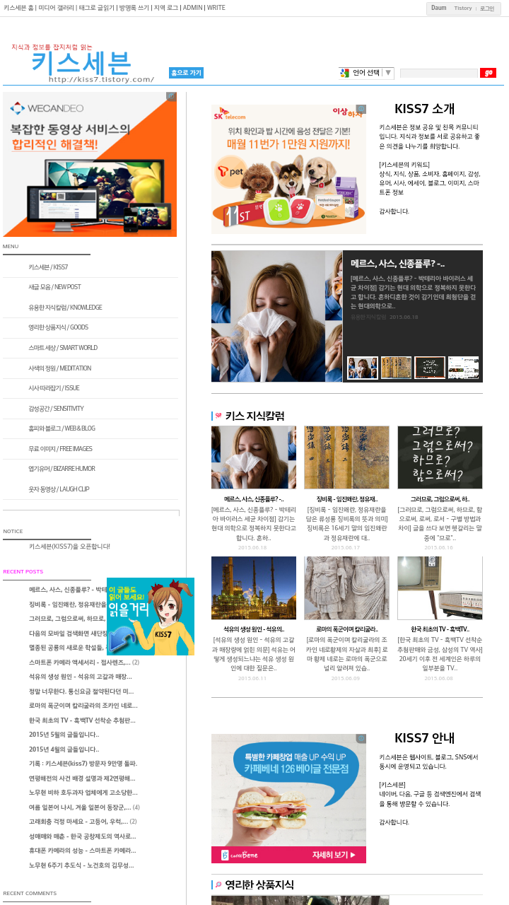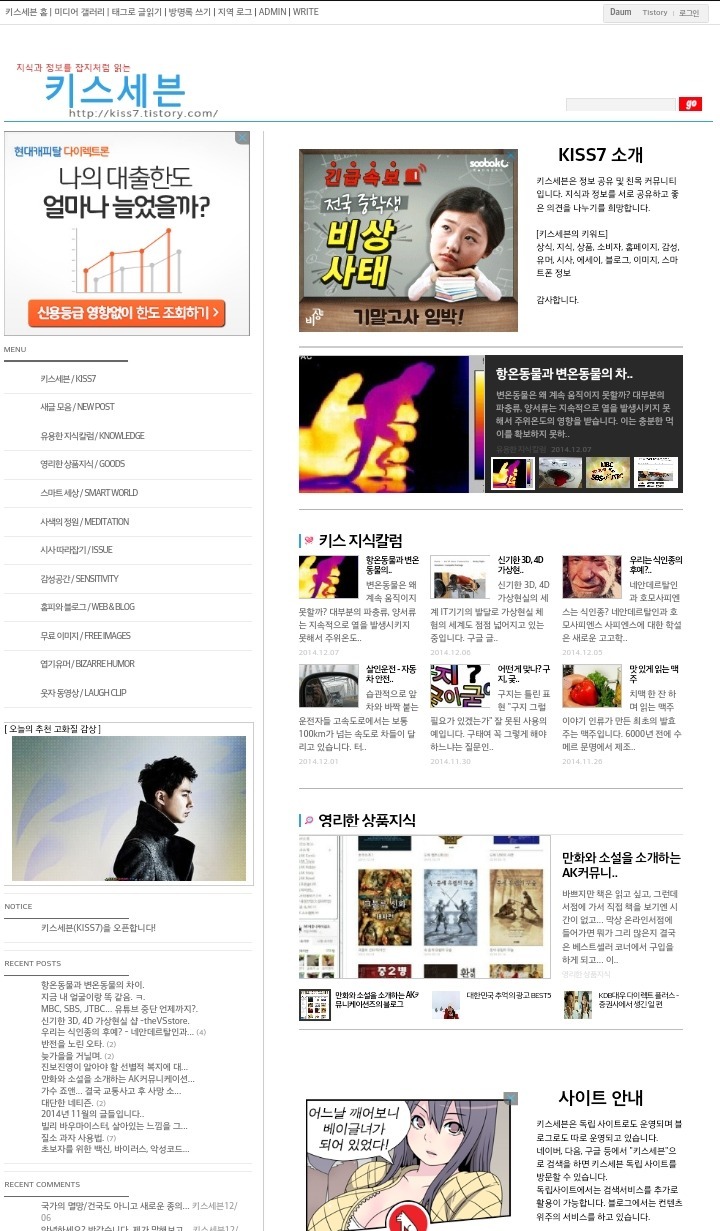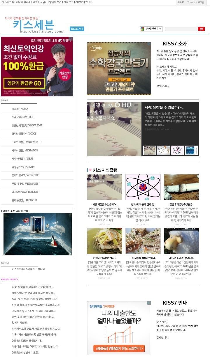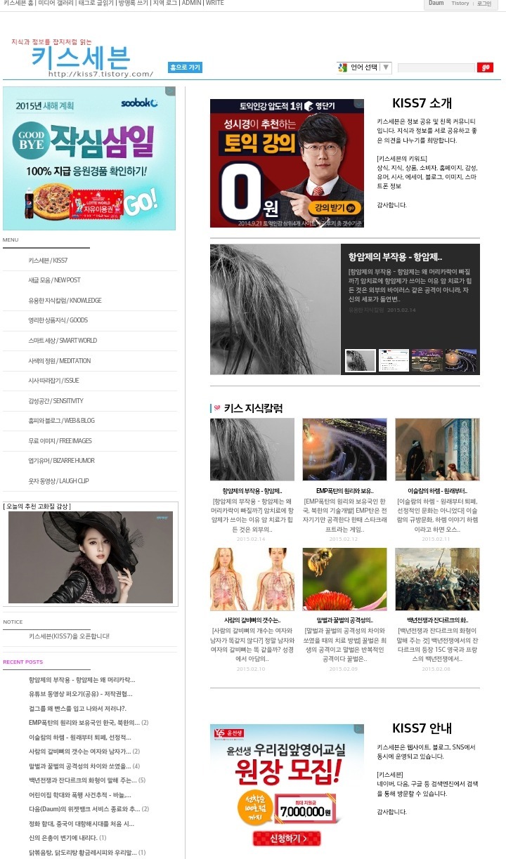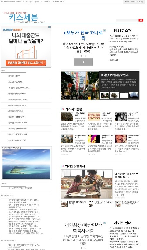 블로그 키스세븐지식은 "심심할 때 잡지처럼 읽는 지식"이라는 목적으로 운영되고 있으며, 키스세븐(http://www.kiss7.kr) 서비스들과 연계되어 있습니다.