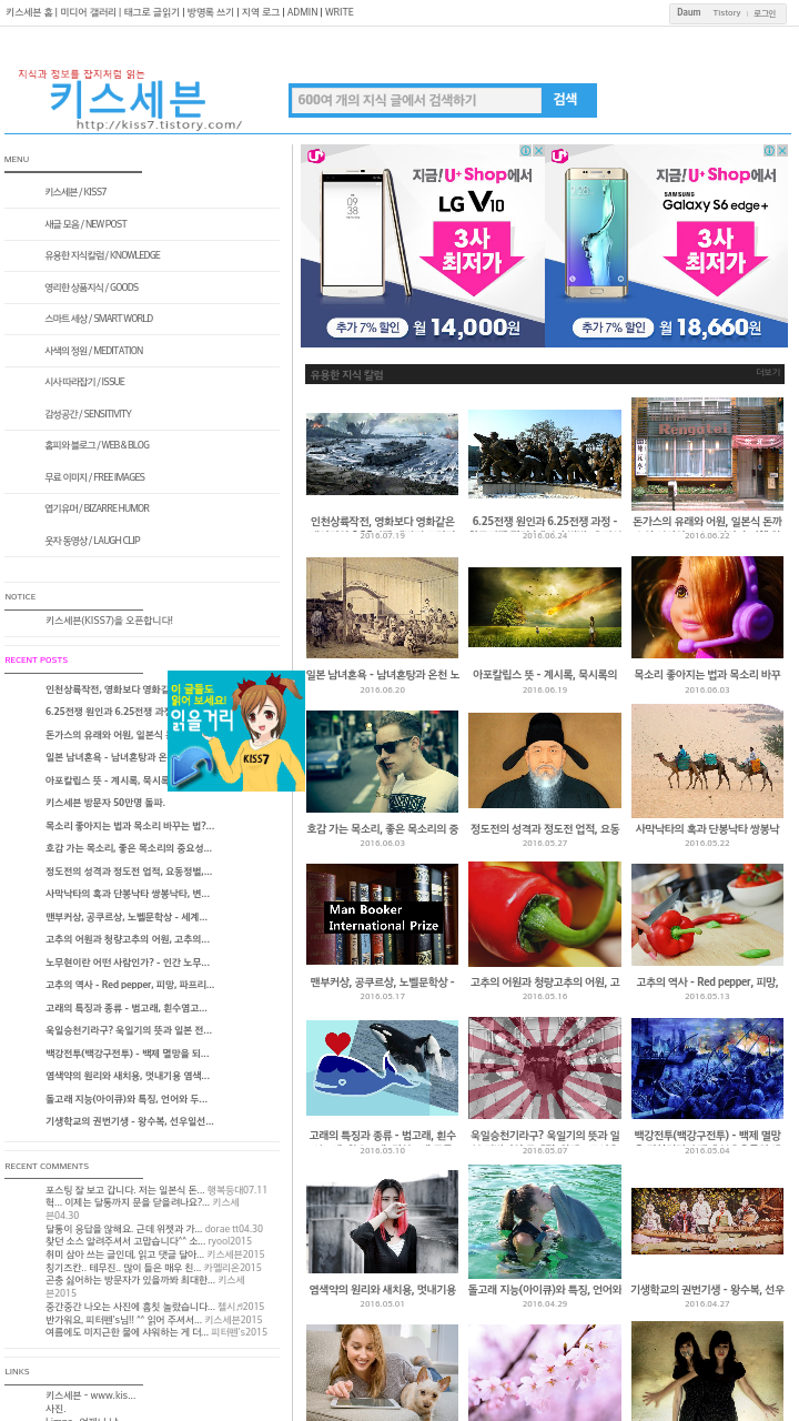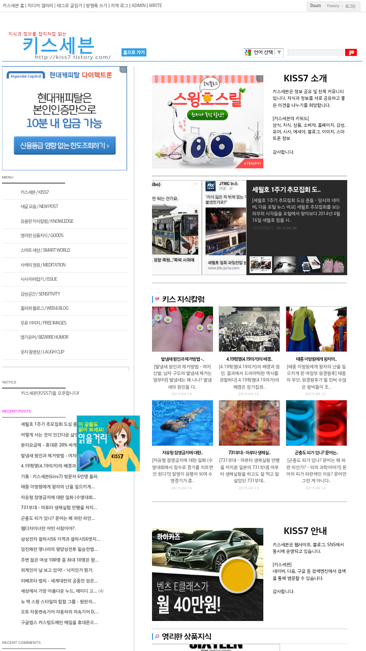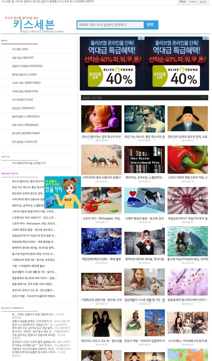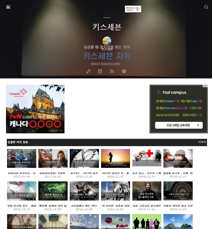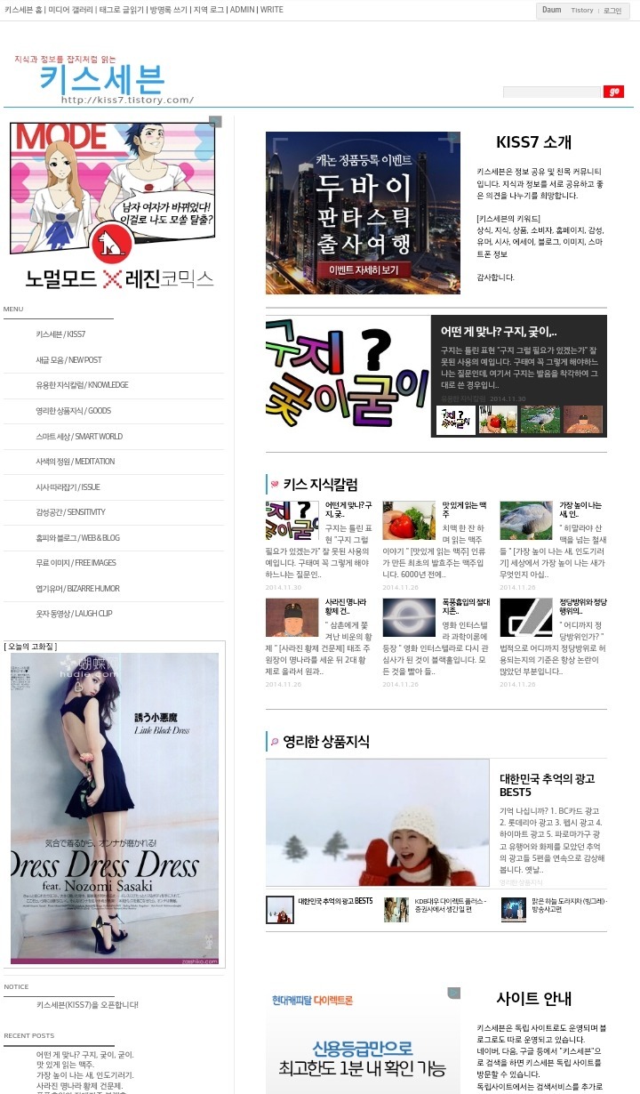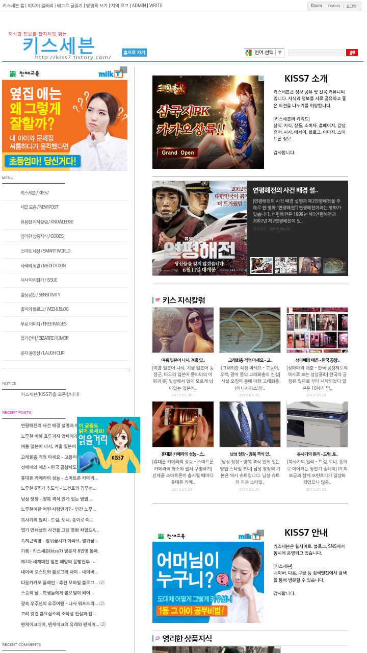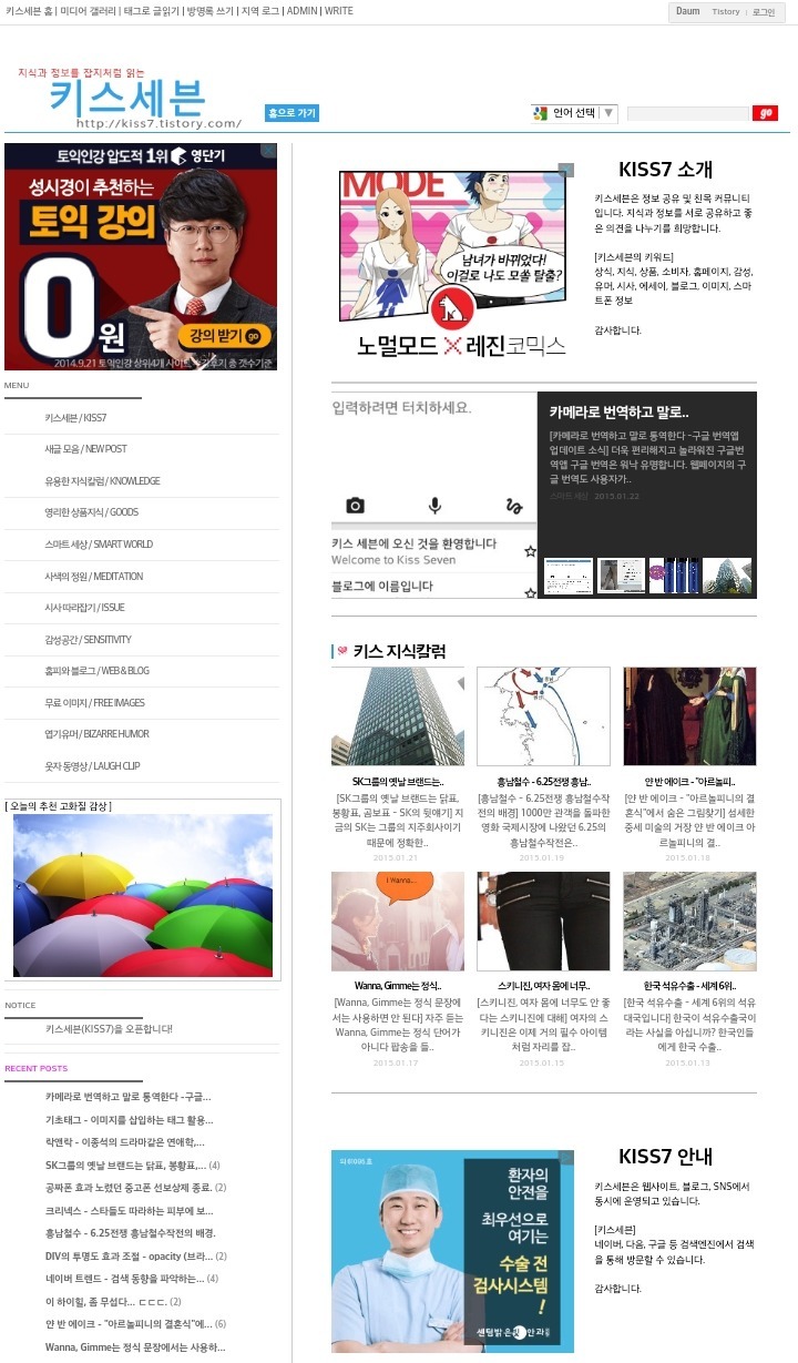 블로그 키스세븐지식은 "심심할 때 잡지처럼 읽는 지식"이라는 목적으로 운영되고 있으며, 키스세븐(http://www.kiss7.kr) 서비스들과 연계되어 있습니다.