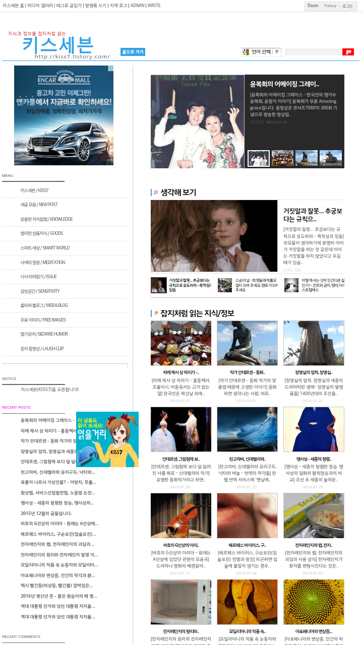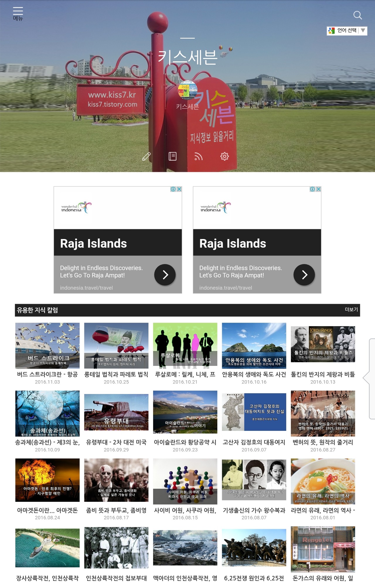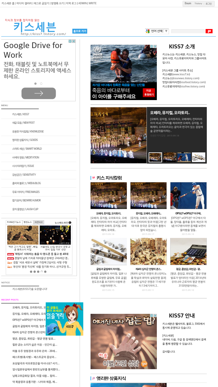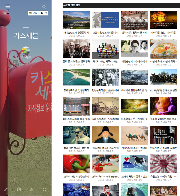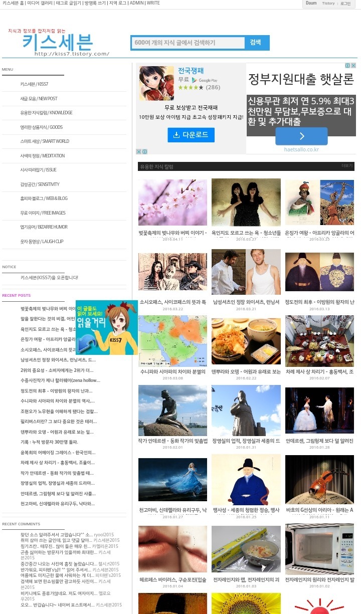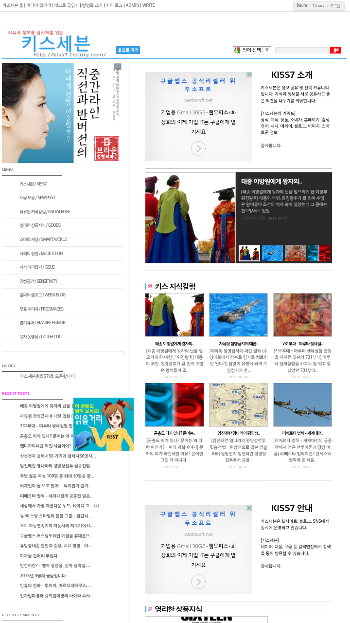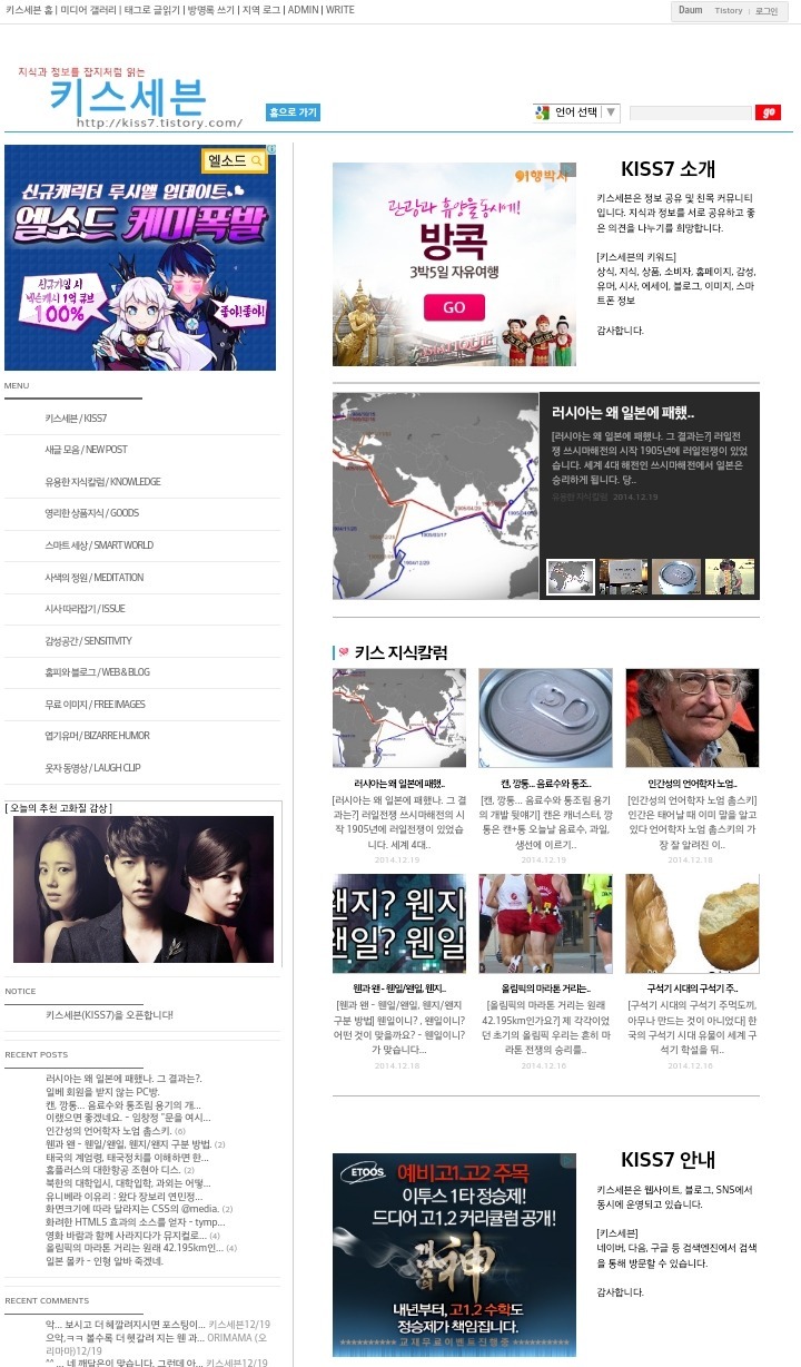 블로그 키스세븐지식은 "심심할 때 잡지처럼 읽는 지식"이라는 목적으로 운영되고 있으며, 키스세븐(http://www.kiss7.kr) 서비스들과 연계되어 있습니다.
